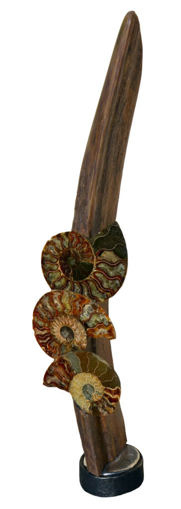 Dans une quête incessante de la courbe, les pièces de bois glanées ici ou là sont transcendées,  sublimées et naissent ainsi à une seconde vie.